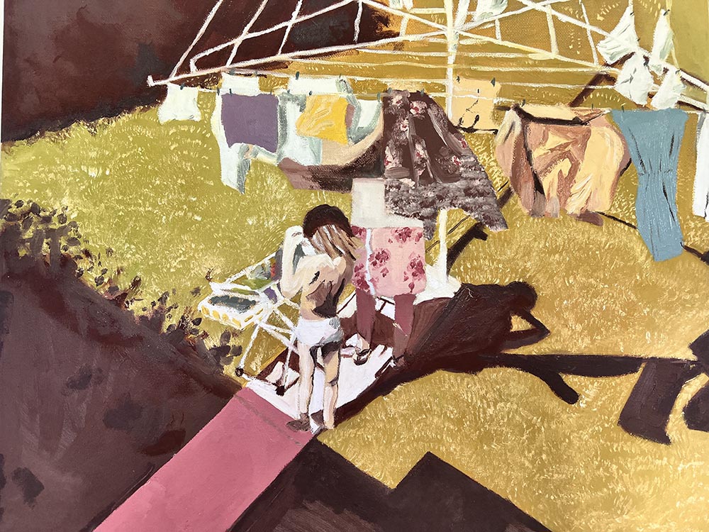 Artist Statement:Folding is an oil on canvas painting exploring the fragility and selectivity of memory and nostalgia. Working from a personal context, I chose not my own core memory, but one belonging to my mother and grandparents. By removing the faces, I strip away the most identifiable and emotionally charged elements of the people, echoing how memories can fade, fragment and lose clarity over time. This absence invites viewers to focus on gesture, setting and detail, rather than identity, allowing space for their own interpretations. Painting a memory, I can never truly experience adds a layer of distance and longing, transforming the work into both a tribute and an act of imagination. The decision to use an image without faces challenges the conventions of personal photography, prompting questions about what is remembered, what is forgotten and why certain moments are preserved in our collective and personal histories.