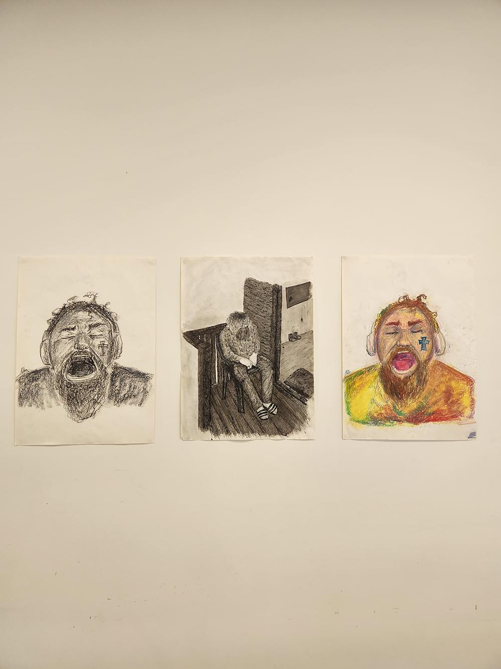 Artist Statement:This body of work delves into the daunting reality of schizophrenia throughout the ongoing life experience of my 35-year-old brother. Schizophrenia is unrelenting—it blurs the line between what is real, and what isn’t. This collection consists of 3 pieces which explore the toilsome concept of both the emotions and experiences that accompanies schizophrenia. The ink on my main work serves as the dull emotions clouding one’s mind during an episode, withholding a stark imagery of what schizophrenia looks and feels like. The floorboards below my brother’s gloomy figure have 3 hidden words on each timber slate, which embody the eerie voices he hears amidst an episode. The jagged, misplaced lines seen throughout each of my pieces represent his mindset—further exploring the factor of this mental illness, ‘Everything feels wrong’.