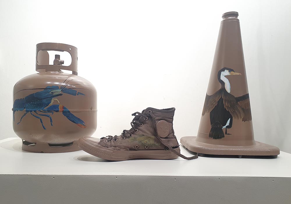 Artist Statement:The 3-piece, sculptural work, Seamless Interaction, explores the effect pollution has had on the Nogoa River, which passes through the township of Emerald in Central Queensland and the ecosystems the watercourse harbours. The animals featured: a Pied Cormorant, Saratoga and Red Claw are native to the region, and all rely on the river to survive and are painted onto alternate canvas’ which are themselves, examples of objects that pollute the river. The objects were initially painted a mid-tone brown to mimic the colour of the river water, reflecting the cohesion between the rubbish, the river and the animals. The work highlights the way the creatures have successfully adapted to their changing surroundings, and it prompts the audience to consider and be in awe of the flexibility and adaptability that animals have had to possess in order to exist in a world of thoughtless humans.