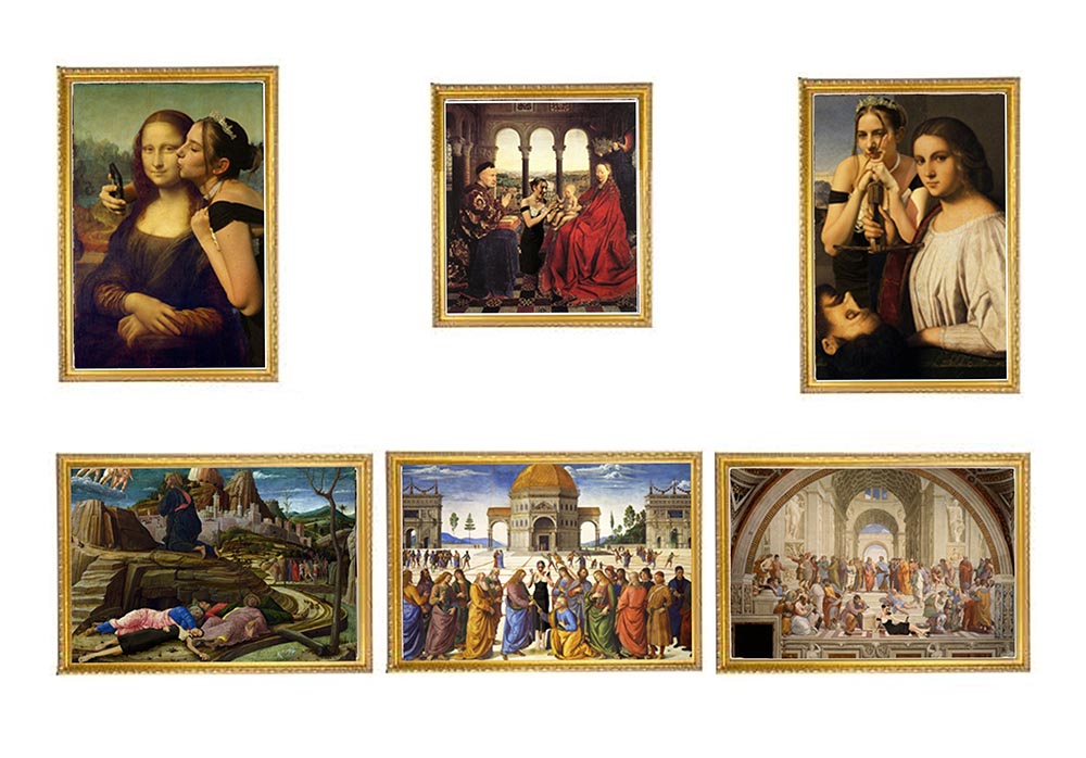 Artist Statement:When researching modern history artists, I stumbled upon Eleanor Antin who recreates historical moments. This inspired me to create my own but instead of recreating why not just add myself in? I bought an outfit online and then I dressed up in a dress, heels and a tiara. My mum helped me take the photos and my dad was a model, so I did the right poses. Then I added the images onto photoshop and after tweaking them endlessly I settled on 6 out of 8 possible images. After they were printed, they were put into golden ornate frames to make them look the part.