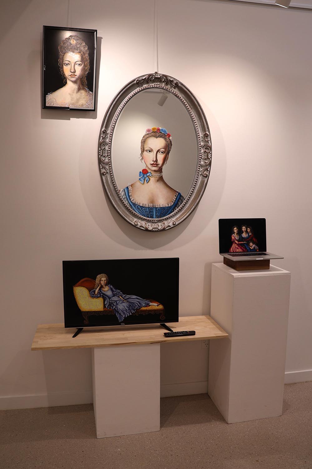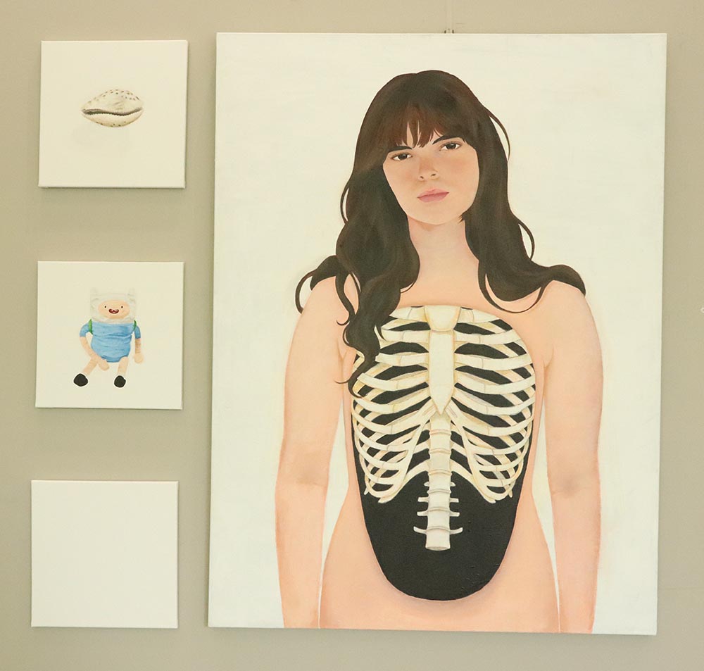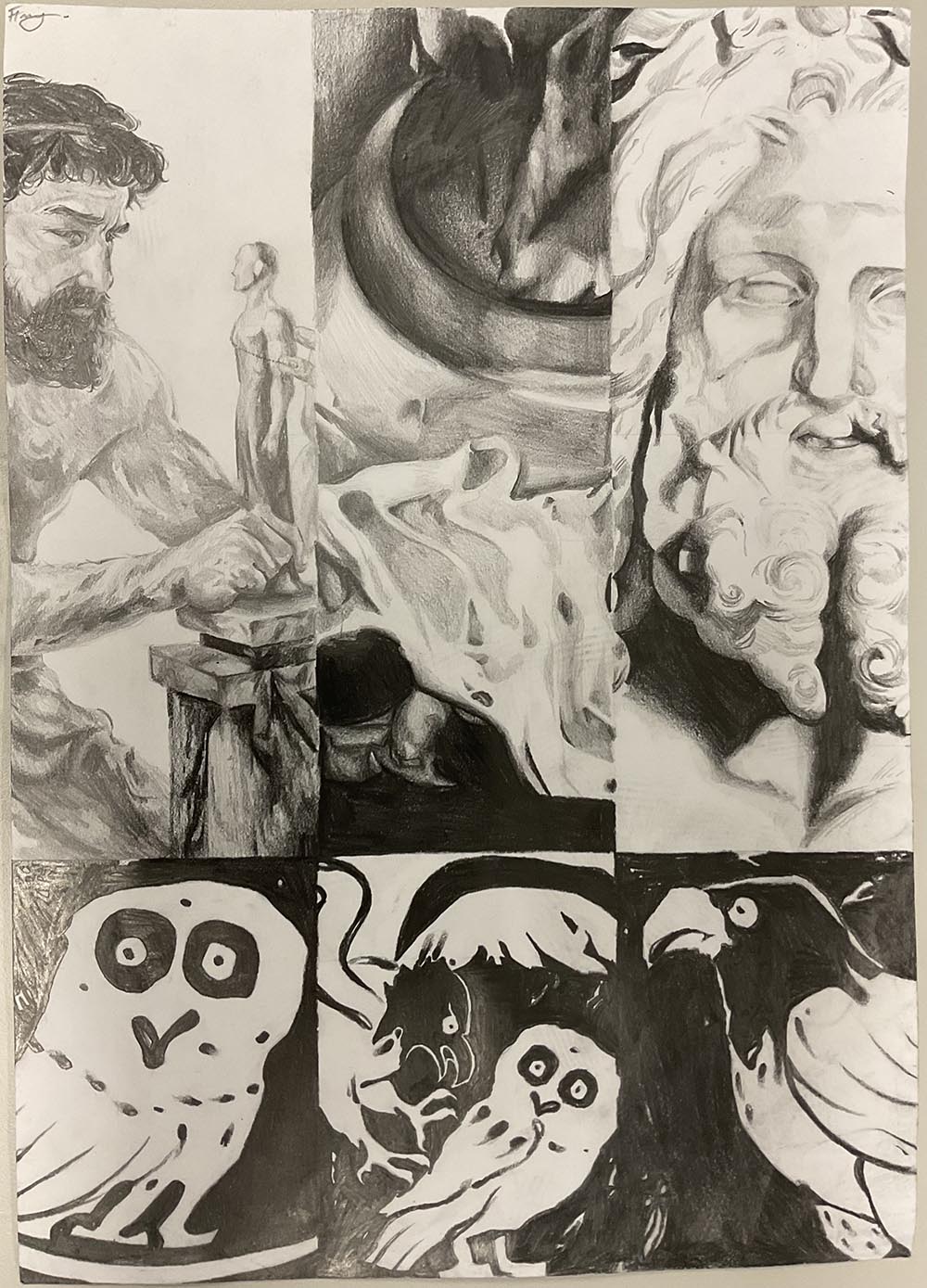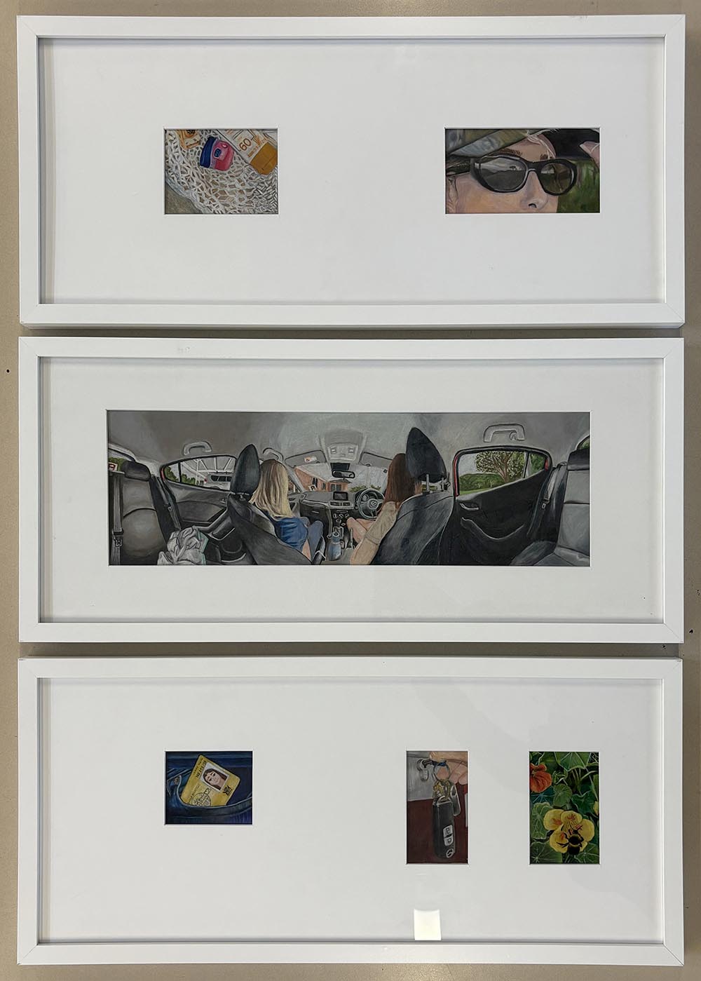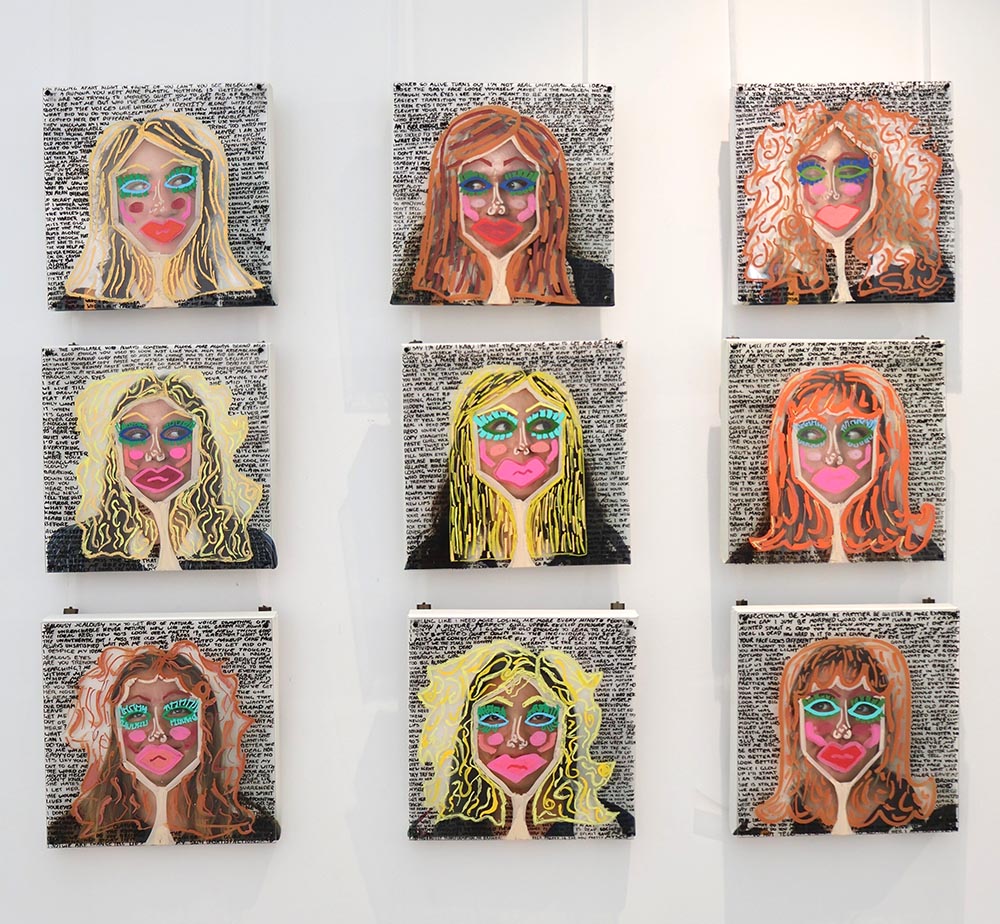 I am a mosaic of everyone I’ve ever met, shaped by not only who I am, but by who the world tells me to be. Nine faces, my friends, my mirrors, layered in fluorescent chaos, masked in unauthentic features. Brunette turned blonde, bare turned botched, each face distorted representing the pressure to glow up, fit in, be more. Their jealous, sad eyes looking around, silently judging, envying and comparing. Written over are the comments and thoughts of our generation, ‘trending’, ‘not enough’, ‘new look’, echoes of posts, critiques and internal thoughts. Each layer becomes a mask, the thicker the paint, the harder to see the girl underneath.