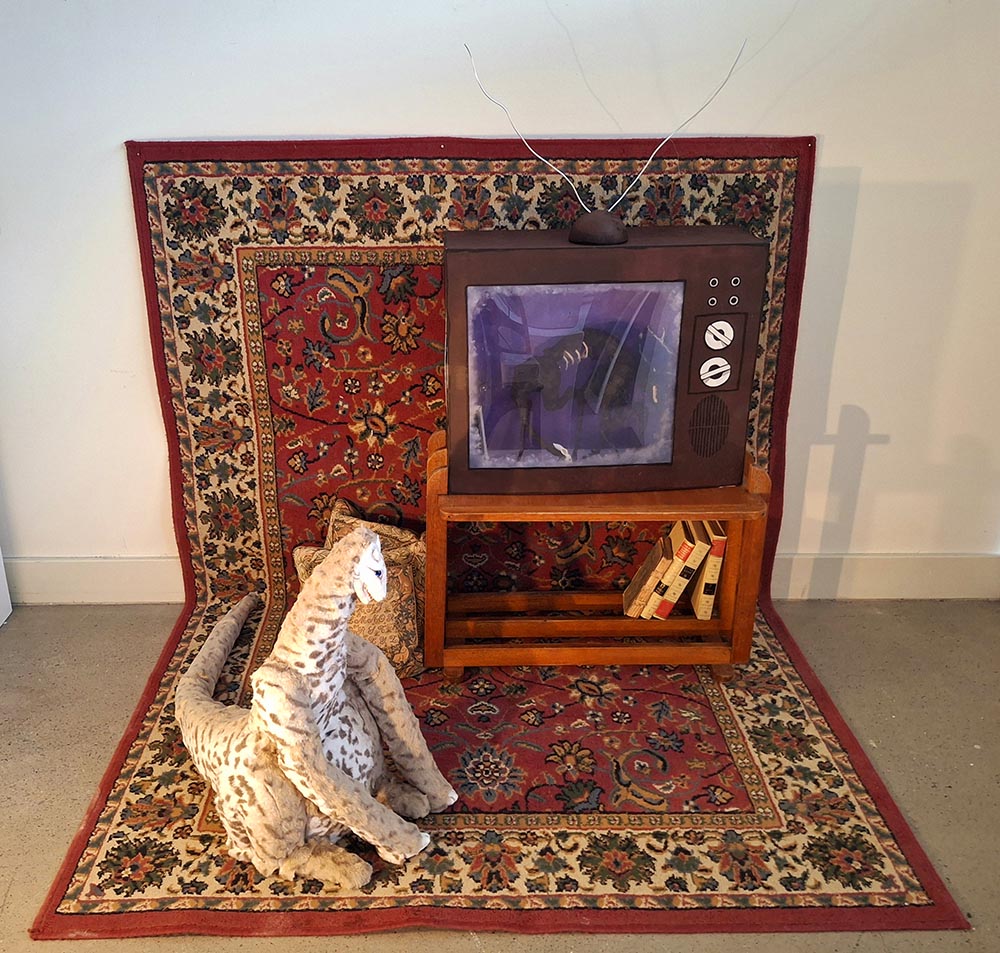 Artist Statement:The Midnight Channel – Just a Dream invites viewers into the familiar comfort of a living room, a space where many unwind in front of the television. Its retro aesthetic and cartoon-like television evoke nostalgia, stirring memories of childhood evenings spent in imaginative escape. Nestled on the rug is a pet-sized creature: an embodiment of warmth, comfort and the sense of belonging that imagination can offer. Inside the television diorama, a dream-like world unfolds, populated by creatures inspired by the shadows children often mistake for monsters. Yet these figures are not threatening; instead, they gently watch over a sleeping child, offering a tender reinterpretation of fear. The ‘television show’ features a shadow puppet—a playful nod to childhood games like casting rabbits on bedroom walls. But its gaping maw and sharp teeth hint at the dual nature of imagination: a force capable of conjuring both comfort and unease.