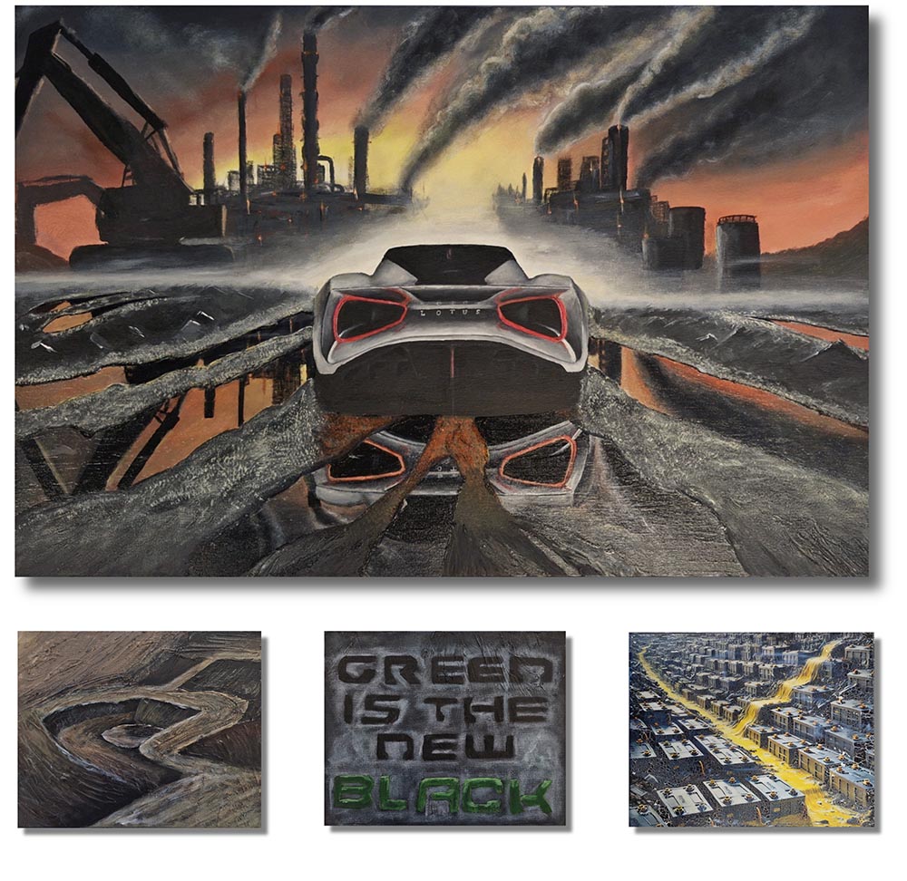 Artist Statement:The resolved work Polished Mythology focuses on a personal and contemporary context and explores how contemporary artists use media and explore environmental and social impacts of evolution and technological advancement in a materialistic world. The name Polished Mythology challenges the glossy narrative that electric vehicles are ‘clean,’ reflecting how society perceives EV’s as the desirable luxuries they are marketed as by businesses, often accepting the appearance of evolution without confronting the environmental impacts. This work also investigates the evolving materiality of contemporary art practices through intentional mixed media experimentation, using layered textures to enhance and communicate thematic depth. The use of a sleek silver electric car positioned as the focal point of the composition embodies societies obsession with technological progression and innovation, while the looming polluted skyline behind it acts as a visual metaphor for the frequently overlooked environmental cost of that advancement.