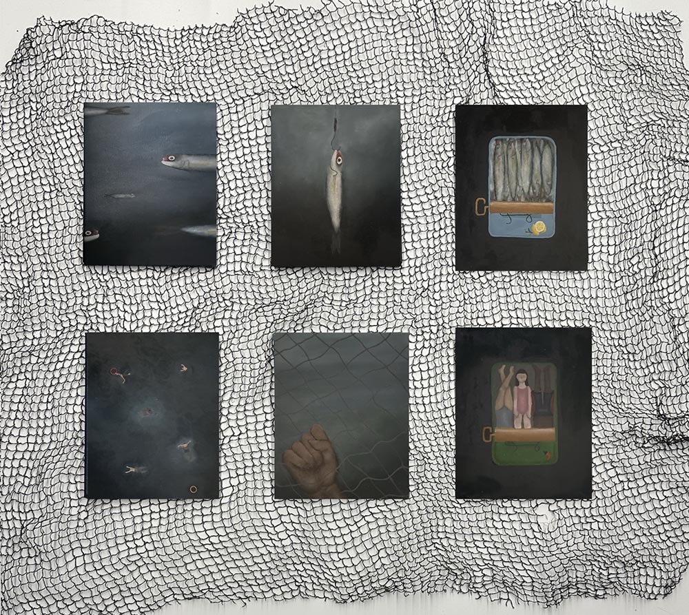 Artist Statement:Humans are deeply connected to nature, yet this connection is becoming increasingly detrimental, as humanity’s actions exploit and destabilise the very environment that sustains us. Dis(connection) mirrors the lives of sardines and humans—free in the ocean, captured and confined in a can—all connected by a single fishing net. The title itself highlights that while we are physically connected to nature, our exploitation and commodification of living beings creates a deeper, more damaging separation, which is reinforced with the contrasting solitary and crowded forms. The sardine becomes a symbol of balance disrupted by greed and capitalism, while the mirrored human scenes force viewers to see themselves within the cycle of exploitation and contemplate our shared fate. Through these visual juxtapositions, I hope to urge audiences to reflect on their own role in this fragile relationship, sparking conversation about our shared responsibility for the natural world.
