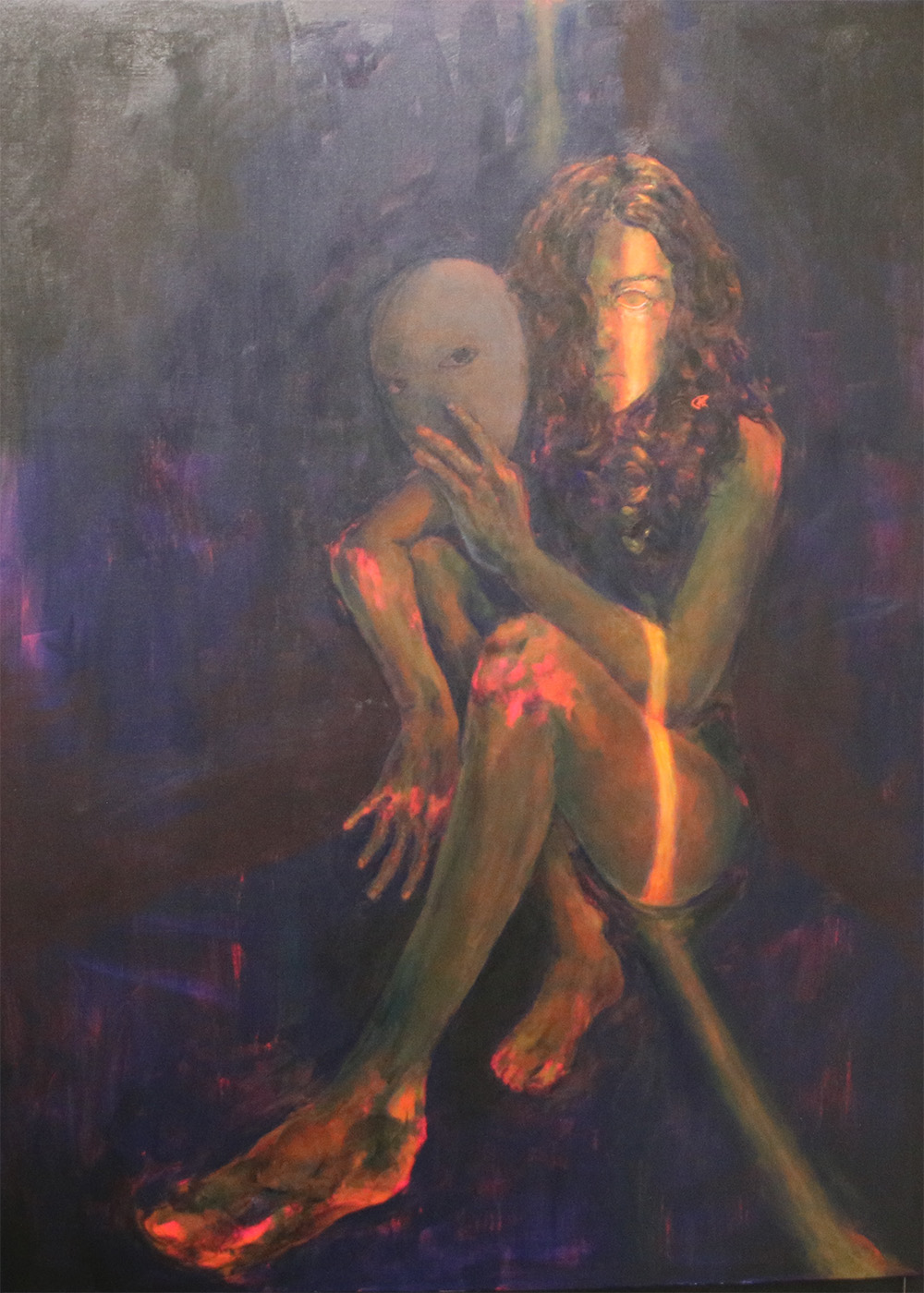 Artist Statement:The ever-growing sensation of being watched is present in many people’s lives. For some it is brief, for some it is constant. External pressure is a source of anxiety in my life, where I feel that every move I make is being watched, analysed and judged. The eyes are the window to the soul, but they can also hide the mysteries of the mind. They are simultaneously a symbol of benevolence and fear, because one thing humankind fears most is the unknown. So, if this person’s motive is unknown, what does their presence signify? Why are they watching? What is their next move?