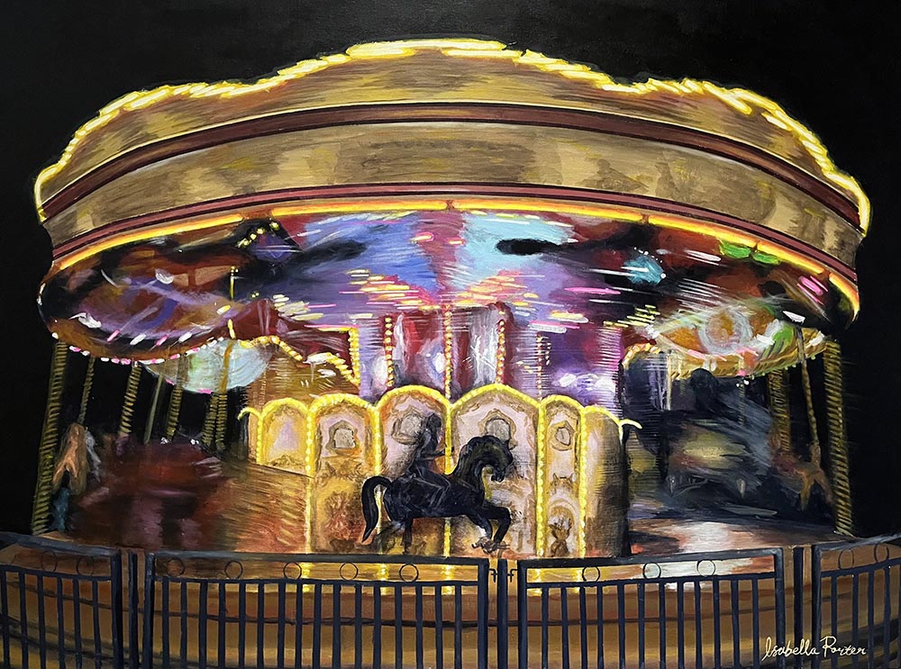 Artist Statement:As the world keeps spinning and the future creeps closer, it's hard to keep up when your heart is stuck somewhere in the past. As the time feels as though its speeding up, there's a bittersweet pull between the comfort of nostalgia and childhood, and the fear and anxiety of the unknown of the future. The Spin of Time explores the feeling of the passage of time and how the feeling of not being able to keep up with adult responsibilities creeping up so fast, and how in that feeling we long for the past. My painting depicts a carousel spinning fast like my thoughts, with the silhouetted figure of me on the carousel. As part of the artwork, a music box plays carousel music. To be used to start slowly and gradually speeding up, showing the speeding up of time and change.