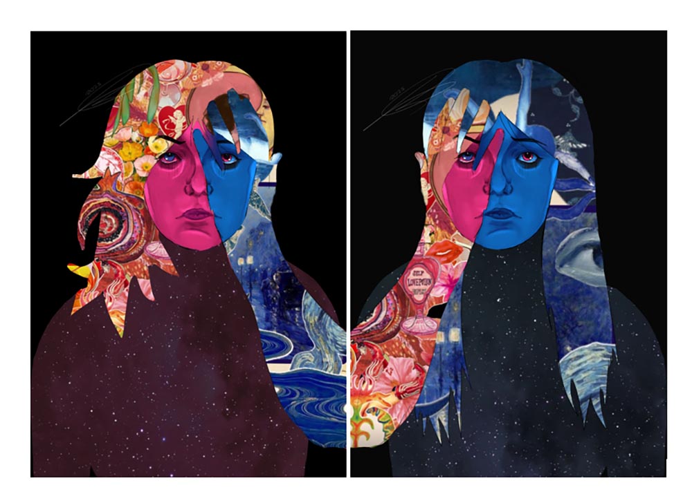Artist Statement:These works explore the instability of identity through duality, masking and inner contradiction. Anger and melancholy are never distinct from one another for me; they are always intertwined beneath the surface, as symbolised by the hand and split face. The collage textures that represent the hair reflect confusion about my self-image by having opposite extremes show chaos and beauty. The figure below the head reflects a deeper frustration: knowing that humans are made up of stardust, yet feeling insignificant, as if I am meant for more than what I currently do. The concealed side exposes the reality I live with—I never really know who I am. These pieces are meant to capture the search for identity when identity itself feels fragmented.